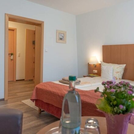 Angenehmes familiengeführtes Hotel, großzügiges Zimmer, freundliches und hilfreiches Personal, geschmackvolle Dekoration Weihnachten/ Silvester, Tolle Silvestergala Kostenloser Parkplatz. Großzügiges Zimmer, bequeme Betten, großes Bad, Tablet mit Infos. Alles sehr lecker, Frühstücksbuffet vielfältig, Rührei/Spiegelei auf Wunsch frisch zubereitet, abends 4 Hauptgänge zur Wahl ( auch vegetarisch und vegan dabei), Vorspeisen und Dessert vom Buffet viel Auswahl, alles handwerklich sehr gut umgesetzt. Silvesterbuffet, Deko und Livemusik mit Tanz ebenfalls großartig Kaffee/Tee-Bar 7-17.00 Uhr inclusive. ..... angenehm warmer Innenpool, (eher klein, dafür 7-22 immer geöffnet, mit "Bikinischleuder"🙂) 2 Saunen, 1 Infrarotkabine, extra Handtücher im Saunabereich inclusive Bibliothek mit Spieltischen Hinter dem Hotel Einstieg in Wanderwege, z. B. Allee der Olympiasieger, Naturlehrpfad Schlossberg. (Dorothea, Holidaycheck: https://www.holidaycheck.de/)