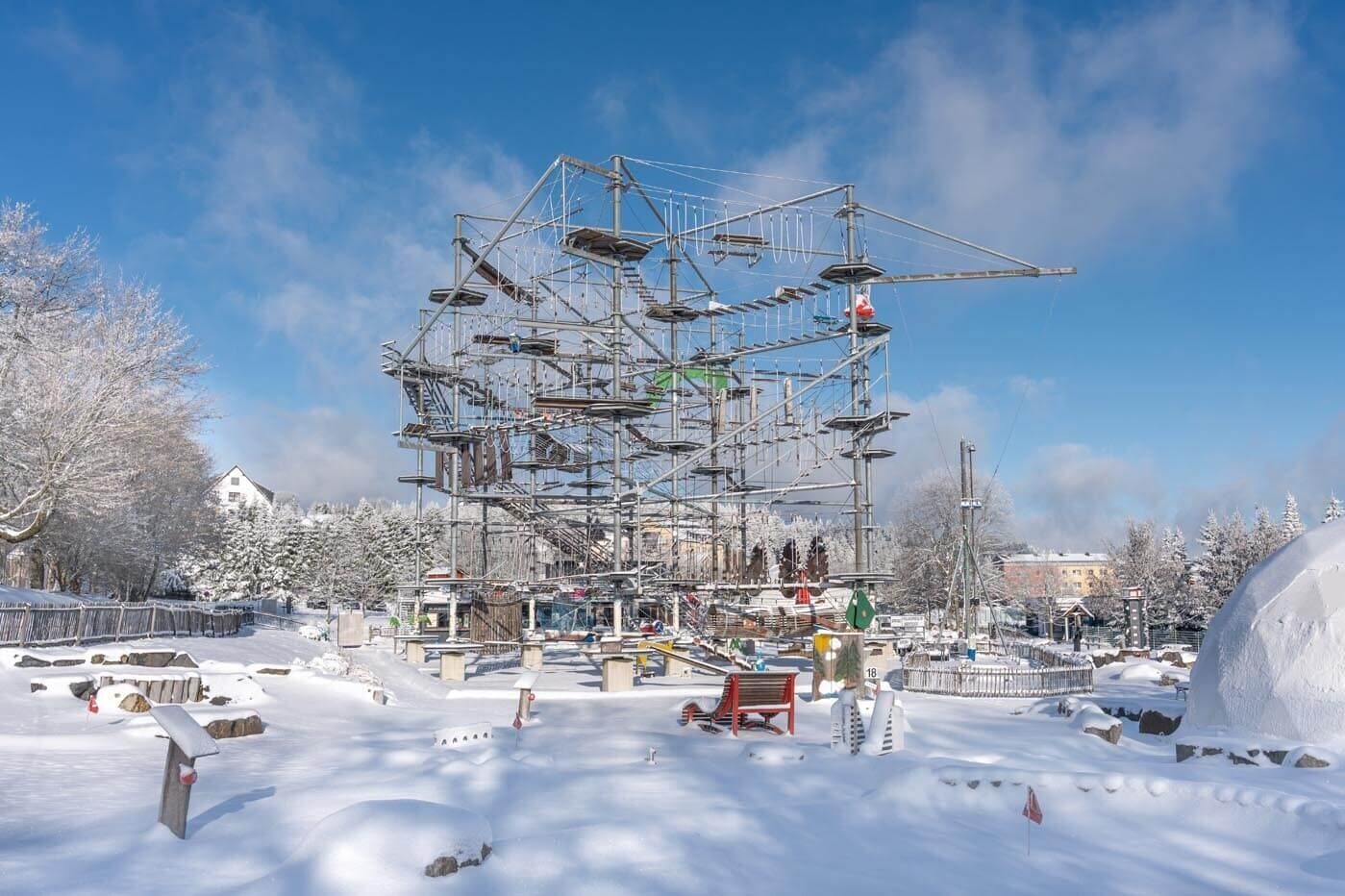 Für Abenteuerlustige und Familien ist der GolfKletterpark in Oberhof ein Muss. Direkt neben dem Hotel gelegen, wartet der Kletterturm mit drei Ebenen voller Herausforderungen. Während die Jüngsten sich auf der unteren Ebene austoben, können Mutige die höher gelegenen Parcours erkunden. Nicht zu vergessen ist die 18-Loch-Abenteuergolfanlage, die weit mehr als nur ein Minigolf-Erlebnis bietet und die berühmten Bauwerke der Region in den Parcours integriert.