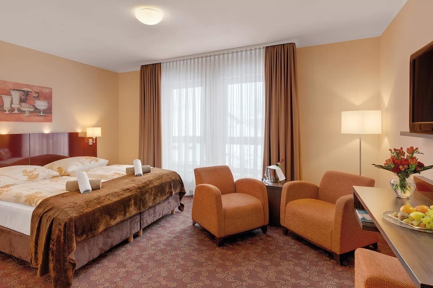 The standard rooms are located in the main building of the Schlossberghotel. They are approx. 20 m² and equipped with carpeted floor, cosy double bed, two cocktail chairs and comfortable shower bath.